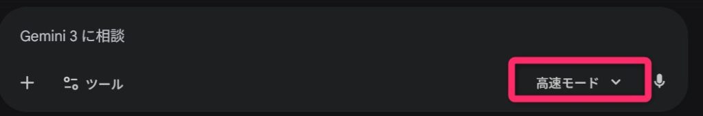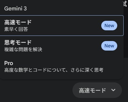 Gemini 3では、用途に合わせて「高速」「思考」「Pro」の3つのモードが用意されています。