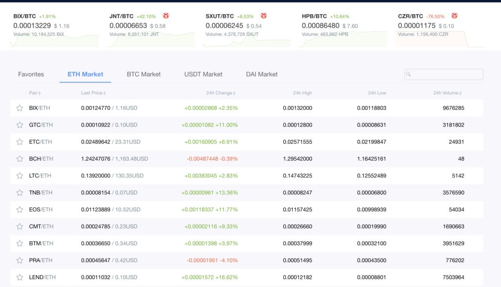 銘柄としてはICOのトークン扱いが多くバイナンスで取り扱われていないものが多いので、明るい将来を見越して値上がりするであろう銘柄を探すにはちょうどよい仮想通貨取引所です。