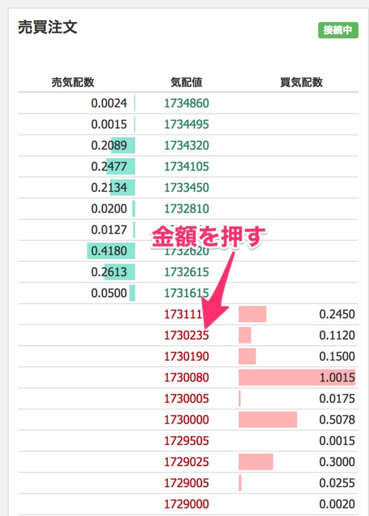 あるいは左下にある売買注文で価格をクリックするとフォームに値段が入ります。