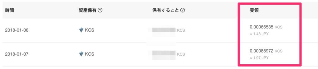 Kucoinを保有して日数が経つと「受領」の欄に配当が分配されていきます。