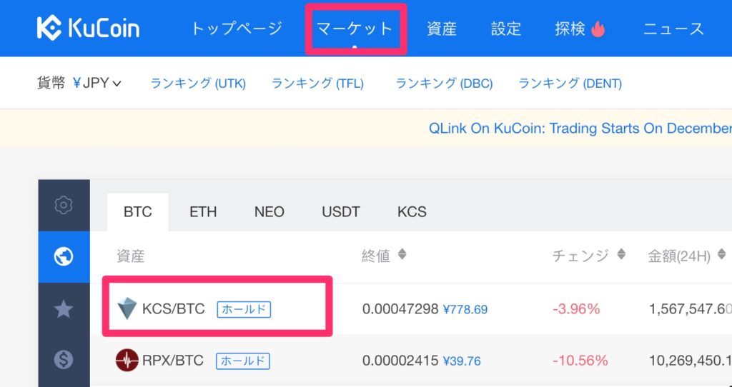 BTC,ETH,NEO,USDT,KCS建てでの購入になるのでビットコインを例にして紹介します。
