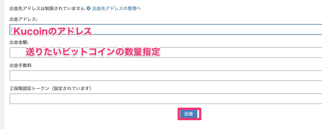 送金先アドレスを「出金アドレス」へコピペして数量をいれ「出金」ボタンをおします。
