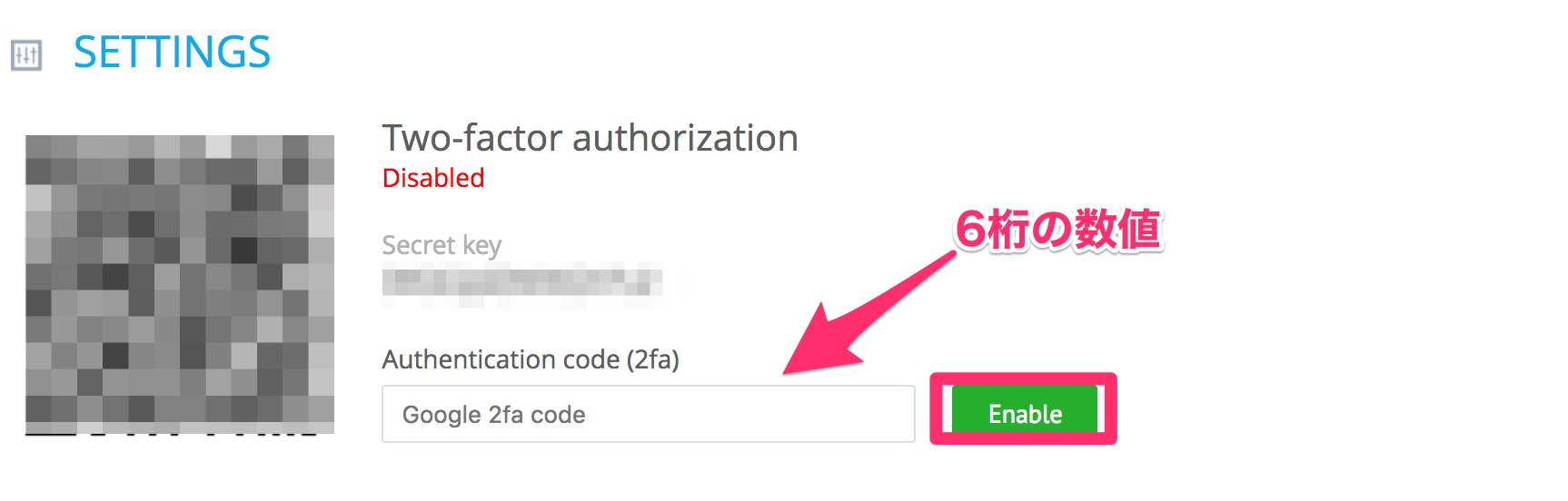 「Enable」のボタンを押すと二段階認証がONになります。